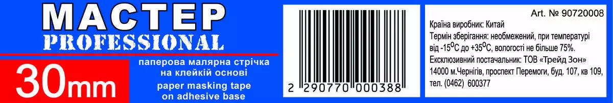 Малярна стрічка"Мастер" 30мм жов.(8сп,48 шт/ящ)Pro